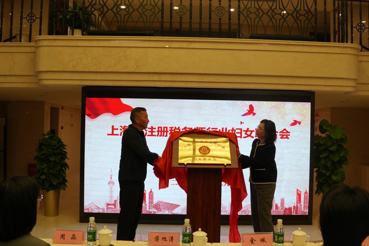 在会议第二阶段的揭牌仪式环节,孙红岩与蒋旭涛共同为上海市注册税务师行业妇女联合会揭牌。